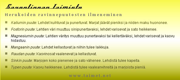 Herukoiden onnistunut kasvatus vaatii hieman perehtymista kasvilajin ravinnetarpeisiin. Monesti luullaan kasveissa olevan jonkin kasvitaudin tai tuhohyönteisen, vaikka kyse onkin selvästä ravinnepuutoksesta. Täältä löydätte perusohjeet siitä, kuinka eri ravinteiden puutostilat ilmenevät herukoilla silmämääräisesti havainnoiden. Kotitarhassa laji on kyllä helppo kasvattaa, mutta jotain kasvun "eväitä" on silti syytä antaa ja niistä huolehtia.